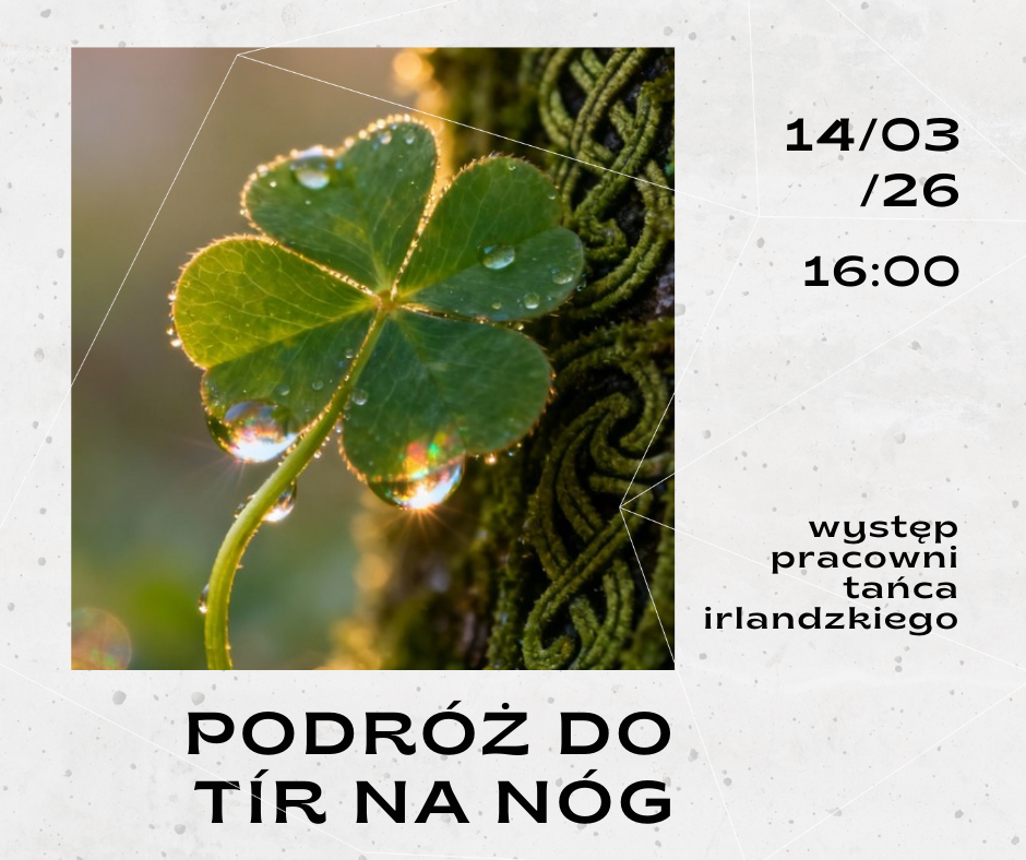 Są takie miejsca, których nie znajdziecie na żadnej mapie. Można do nich trafić tylko wtedy, gdy odważymy się zrobić krok w nieznane… Podobno raz w roku w naszym Domu Kultury otwiera się niewidzialna brama do krainy, w której czas płynie wolniej, a muzyka potrafi zaczarować rzeczywistość. Zapraszamy Was na rodzinną podróż do Tír na nÓg – legendarnej Krainy Wiecznej Młodości. To będzie popołudnie pełne irlandzkiej radości, energii i opowieści, które pozwolą nam na chwilę zapomnieć o codzienności.