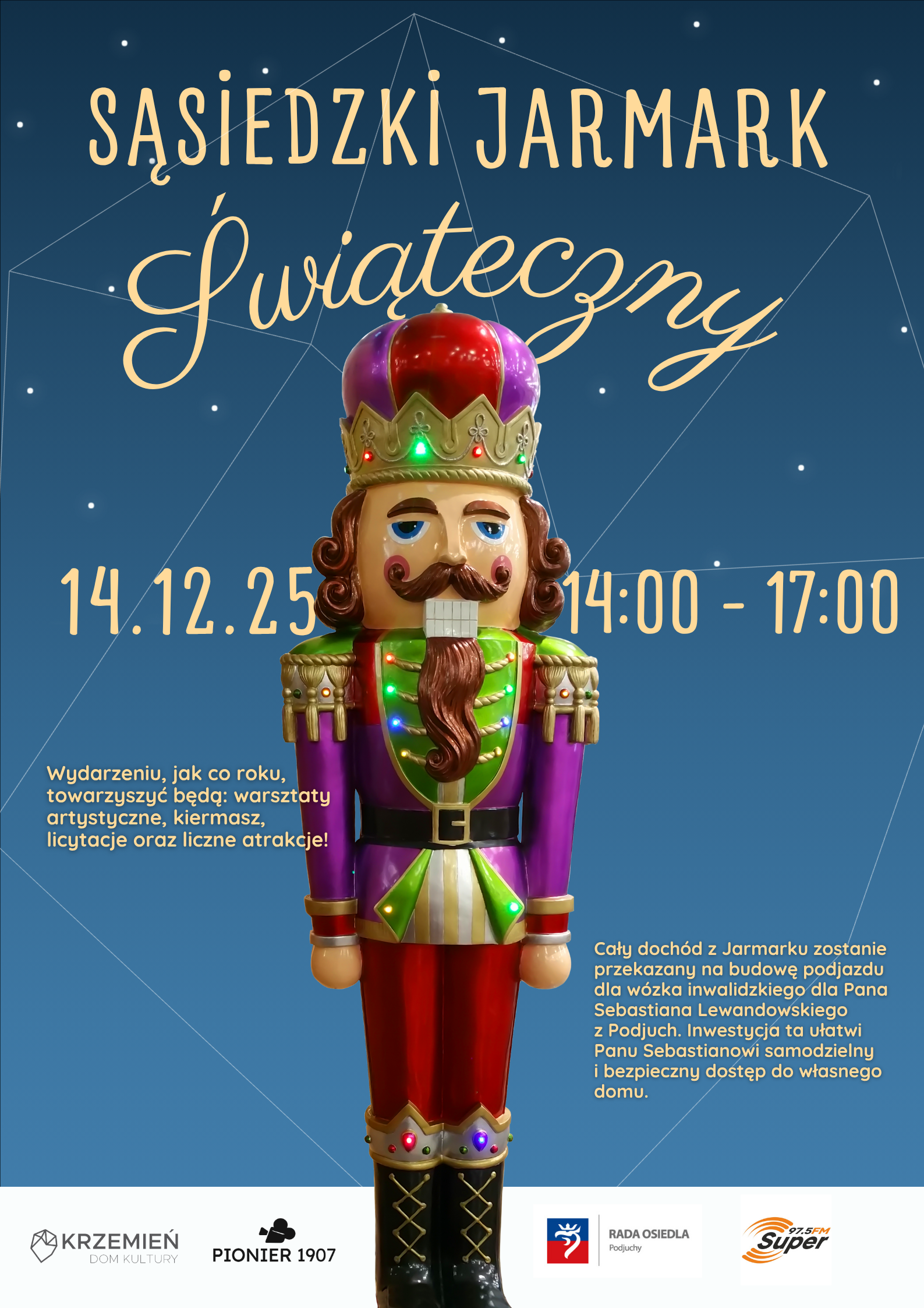 FLAGOWE WYDARZENIE DOMU KULTURY! Tradycyjny Sąsiedzki Jarmark Świąteczny, który ma charakter charytatywny. W tym roku zbieramy fundusze na budowę podjazdu dla wózka inwalidzkiego dla naszego sąsiada, Pana Sebastiana Lewandowskiego z Podjuch. Inwestycja ta ułatwi Panu Sebastianowi samodzielny i bezpieczny dostęp do własnego domu. W ramach Jarmarku, jak co roku, odbędą się darmowe warsztaty, występy artystyczne oraz mnóstwo atrakcji dla dzieci, stanowiąc najważniejszy i najbardziej lokalnie zakorzeniony akcent w grudniowym kalendarzu. To doskonała okazja do wspólnego, świątecznego świętowania i niesienia pomocy. Zajrzyj na naszą stronę, by dowiedzieć się więcej!